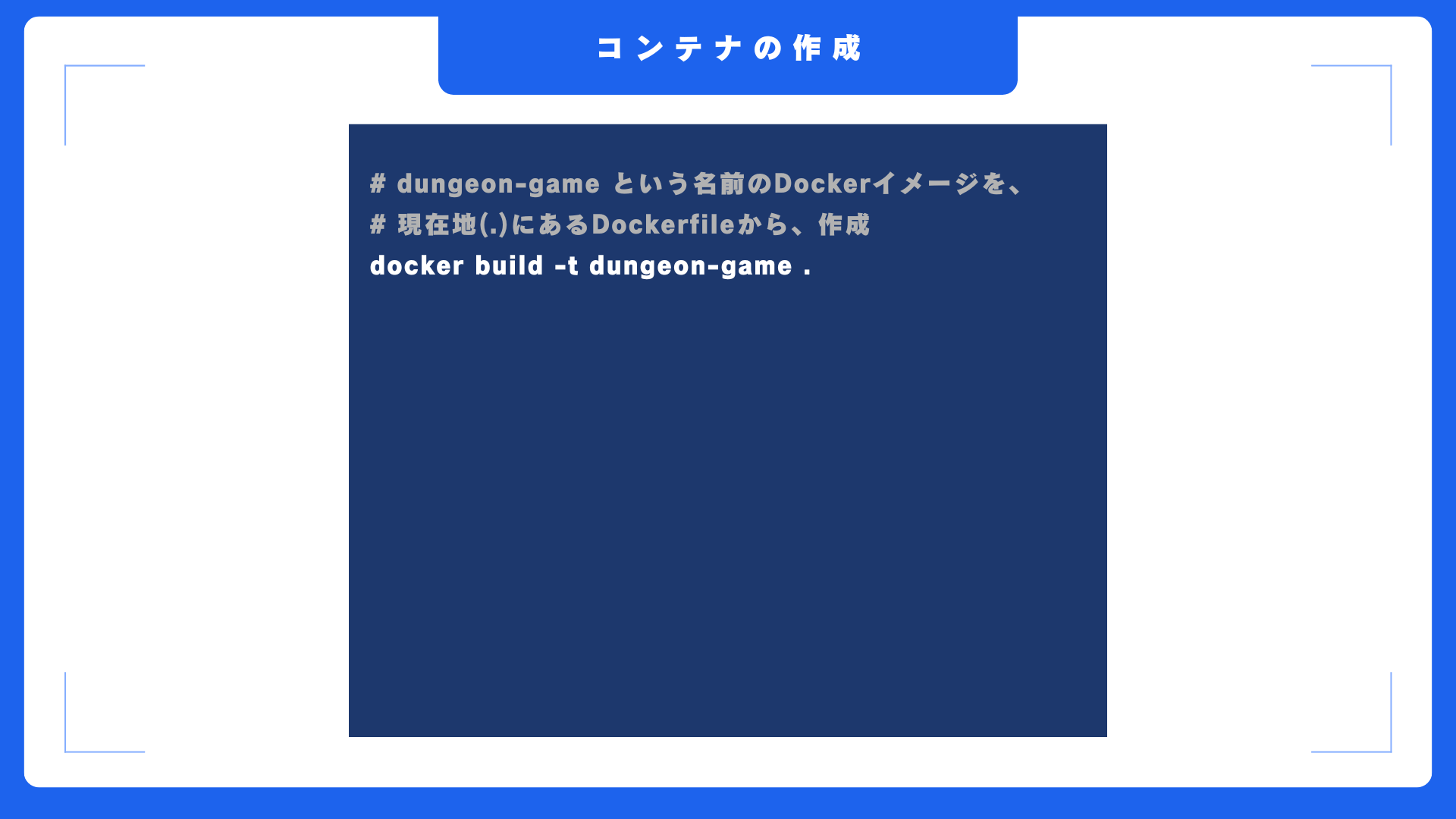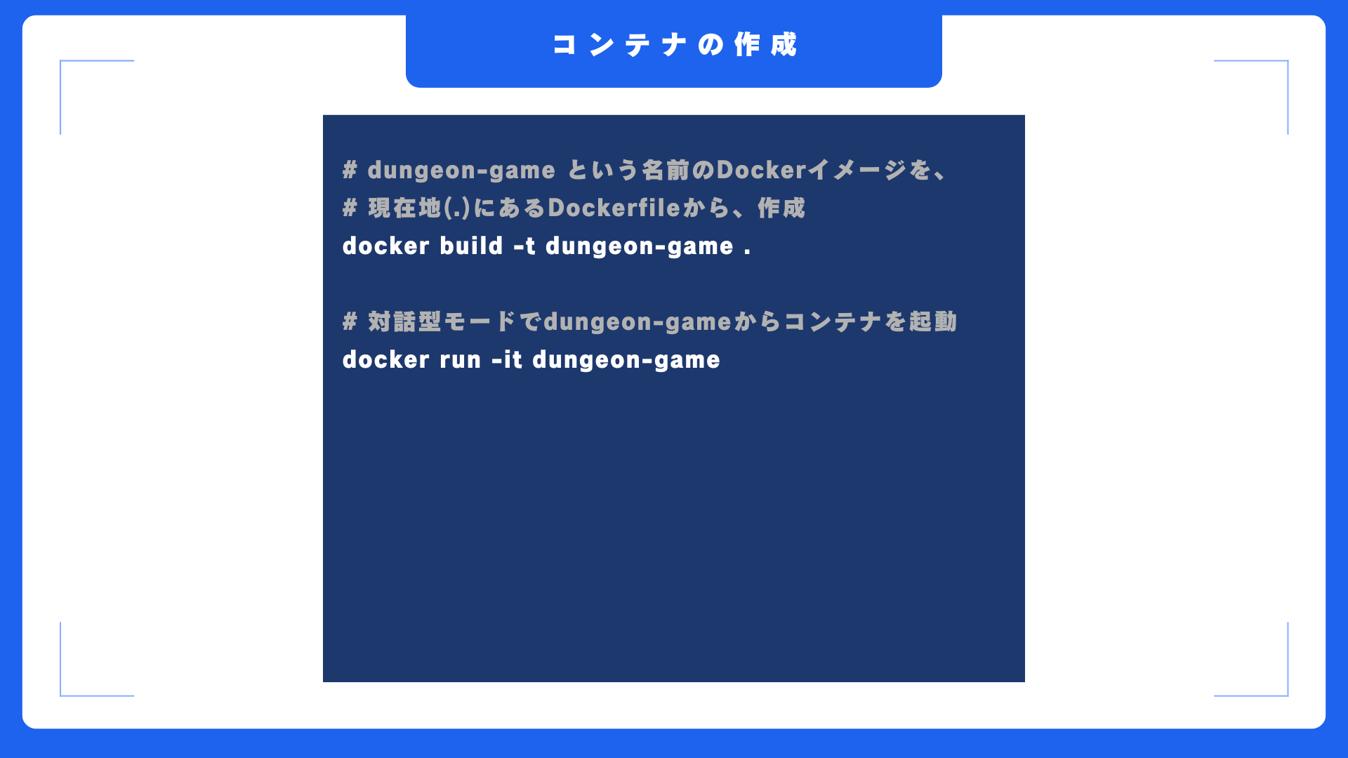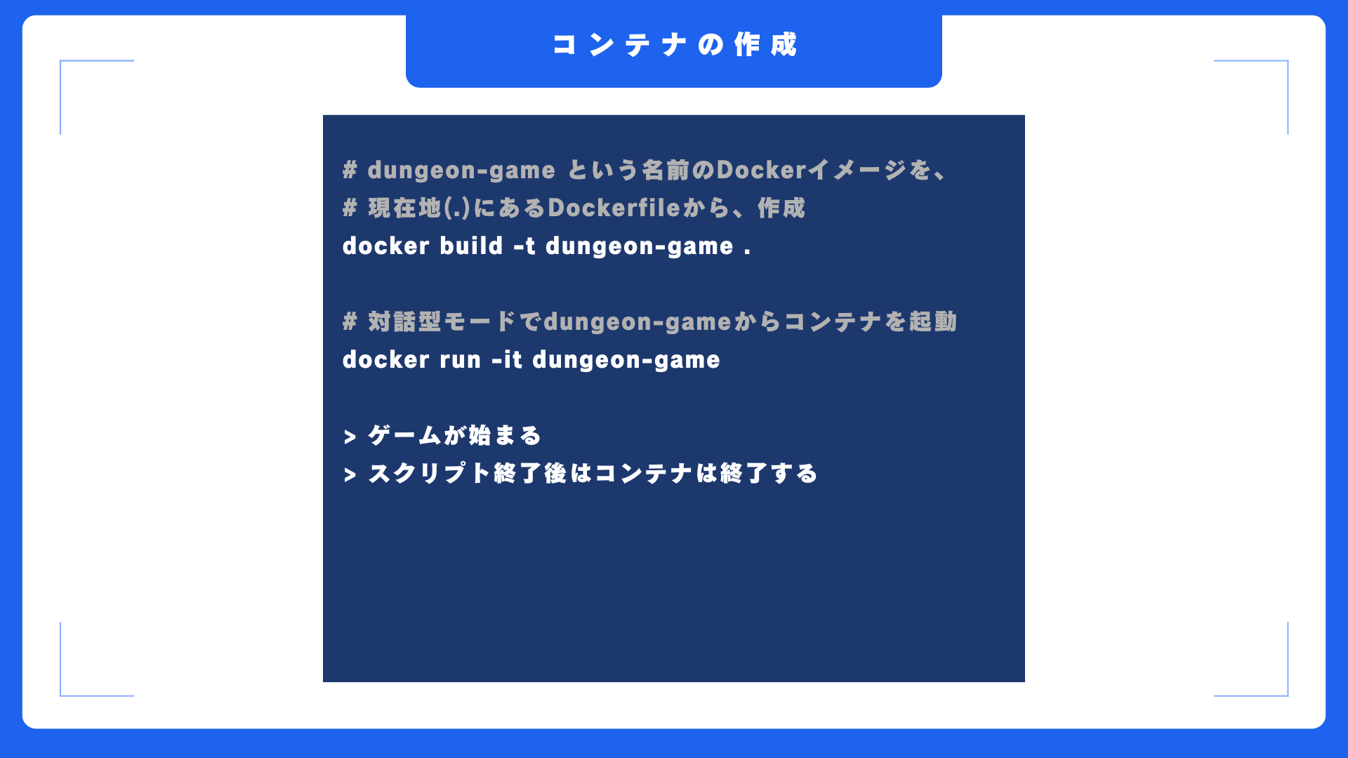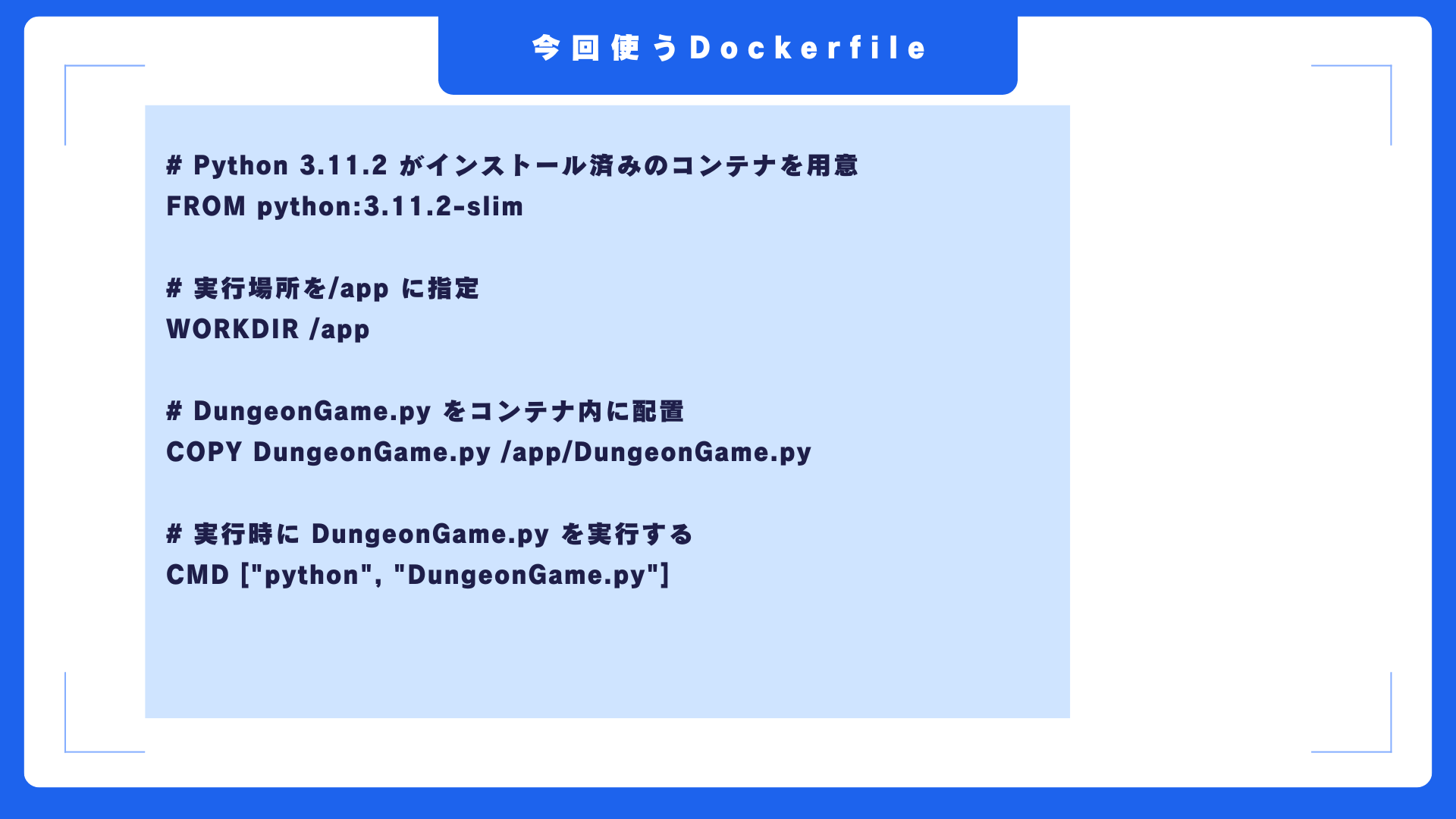 以前、別の動画で作成した、ターミナルでゲームを実行できるDungeonGame.pyというファイルをコンテナ内に配置し、コンテナ実行時にそれを実行し、ゲームを開始するという内容ですね。
