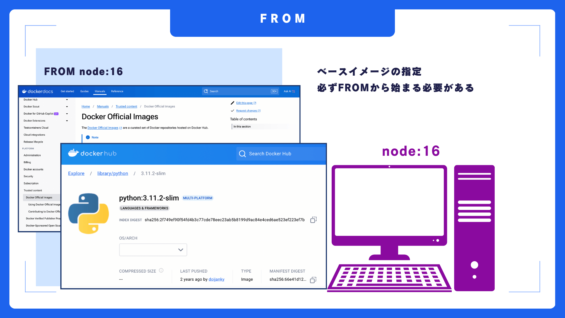 なお、Dockerfileは必ずFROM命令から書き始める必要があります。