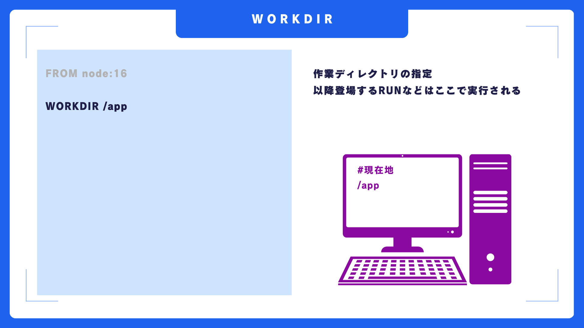 続いて、WORKDIR命令はコンテナ内の作業ディレクトリを指定します。