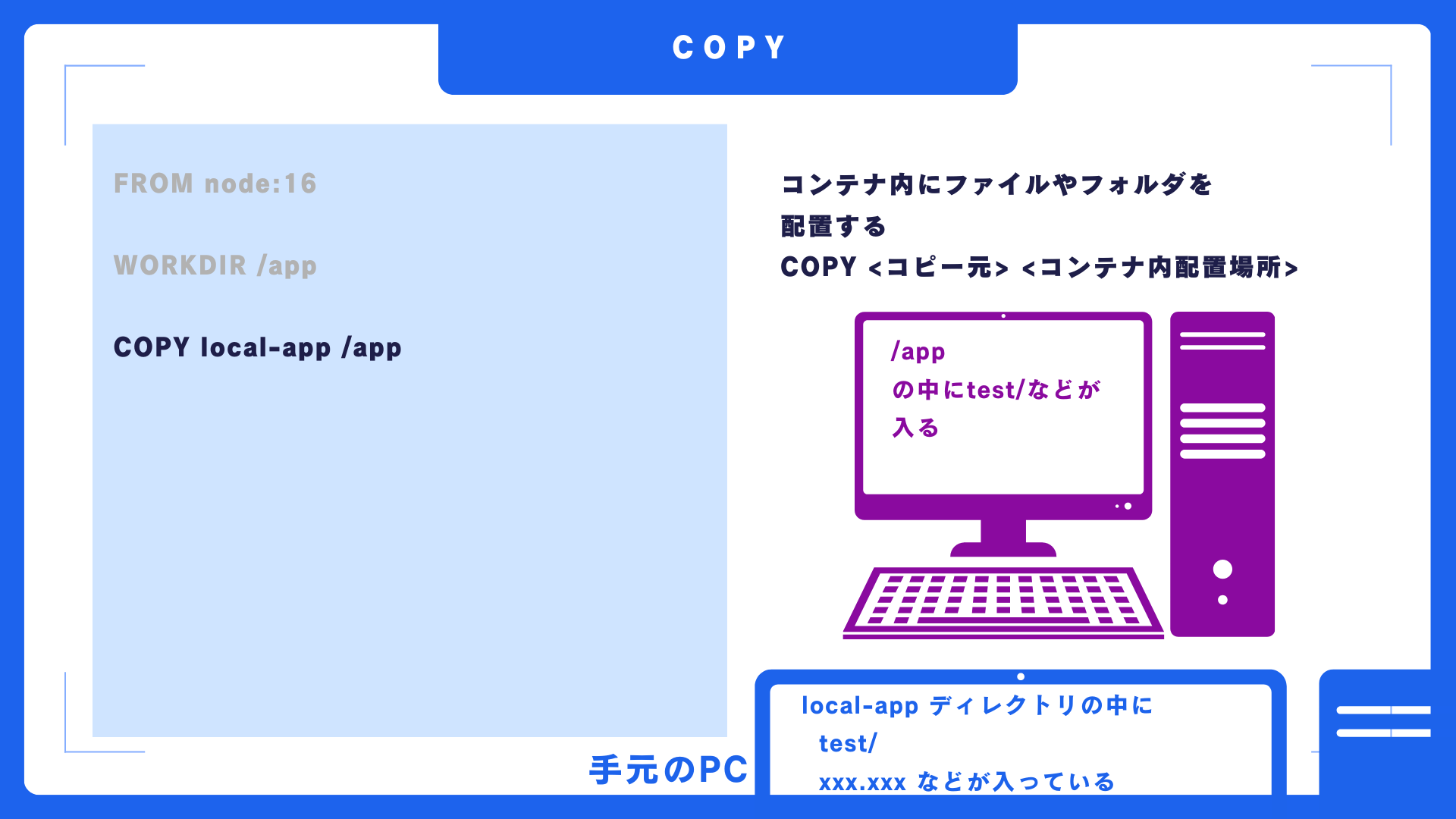 例えばホストマシンのlocal-appというディレクトリの中にtestというディレクトリがあった場合、COPY local-app /app と記述しておけば、コンテナのappディレクトリの中にこのtestディレクトリが入った状態でコンテナが作成されます。