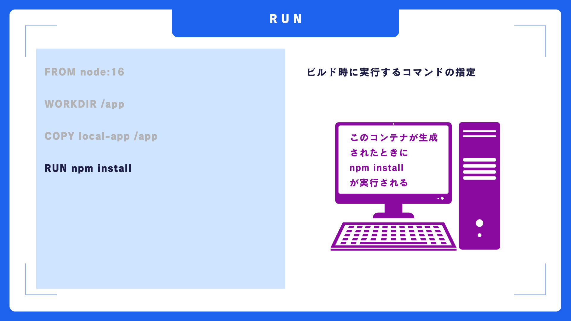 RUN命令はコンテナが生成されるとき、すなわちビルド時に実行するコマンドを指定できます。インストールコマンドなど、一番最初に実行しておきたいものを記述します。