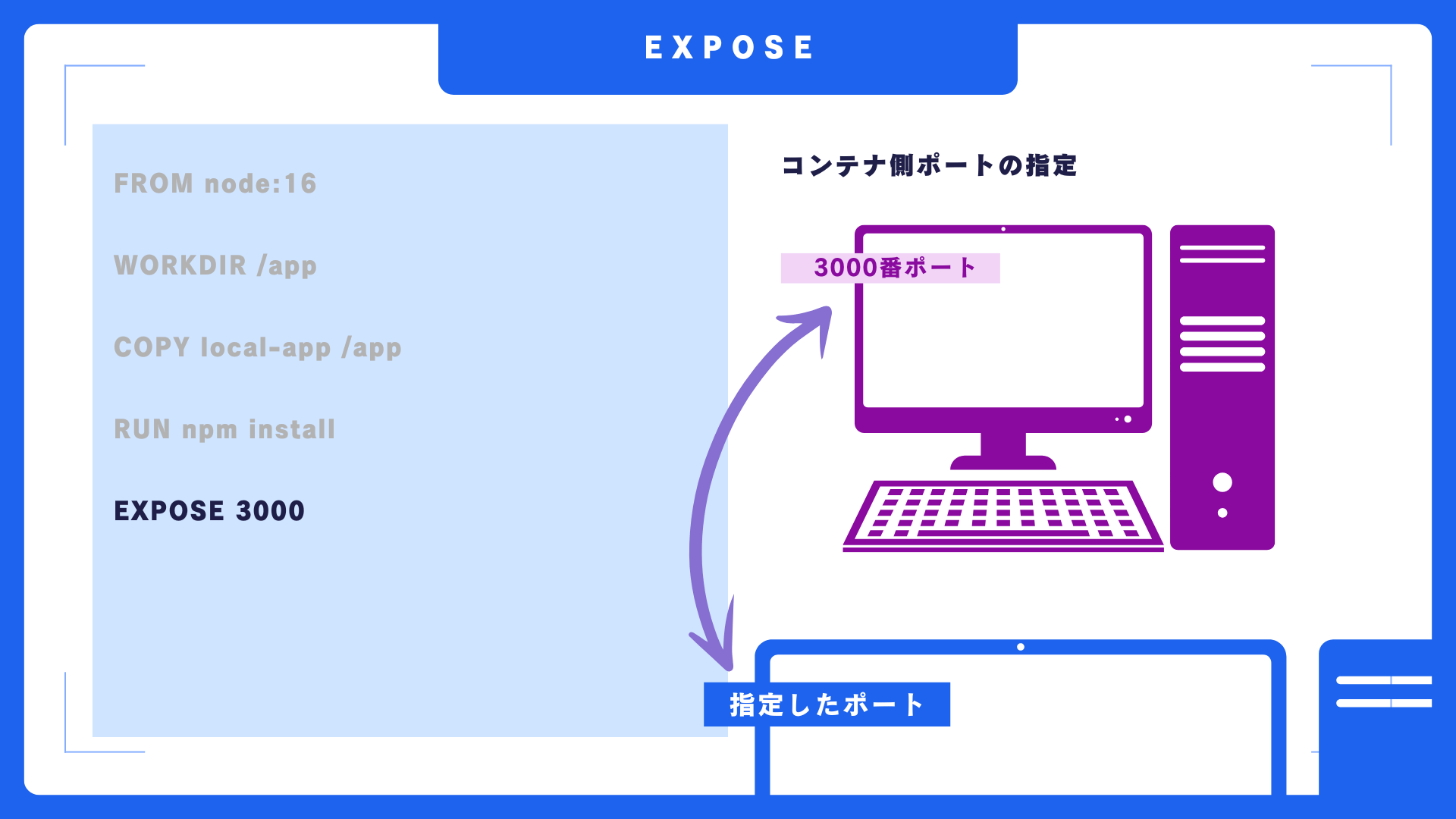 EXPOSE命令は、コンテナ側で使うポートを指定します。これにより、ホストマシン側からコンテナの3000番へアクセスすることができます。