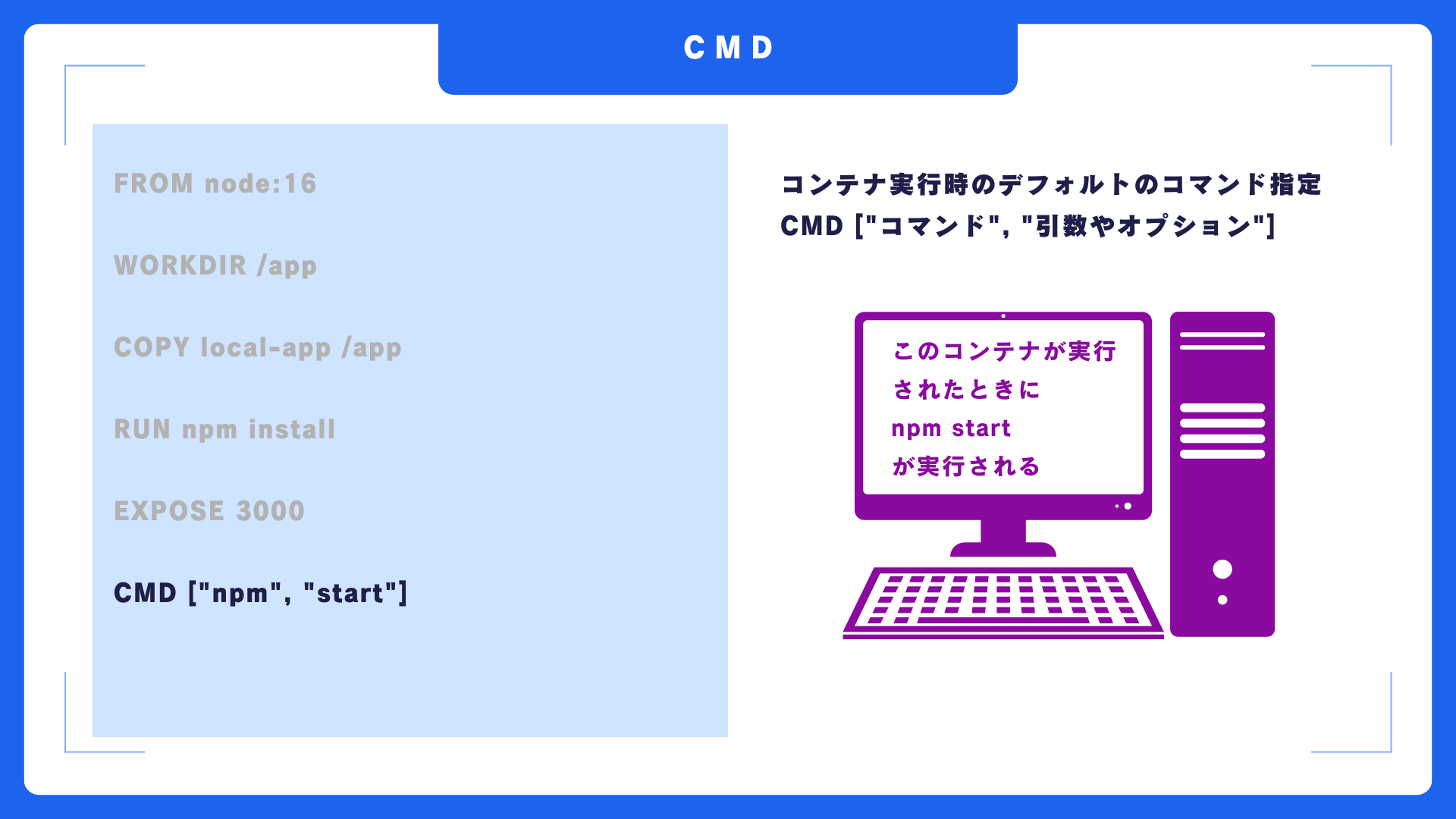 CMD命令は、コンテナ実行時に実行するコマンドを指定します。