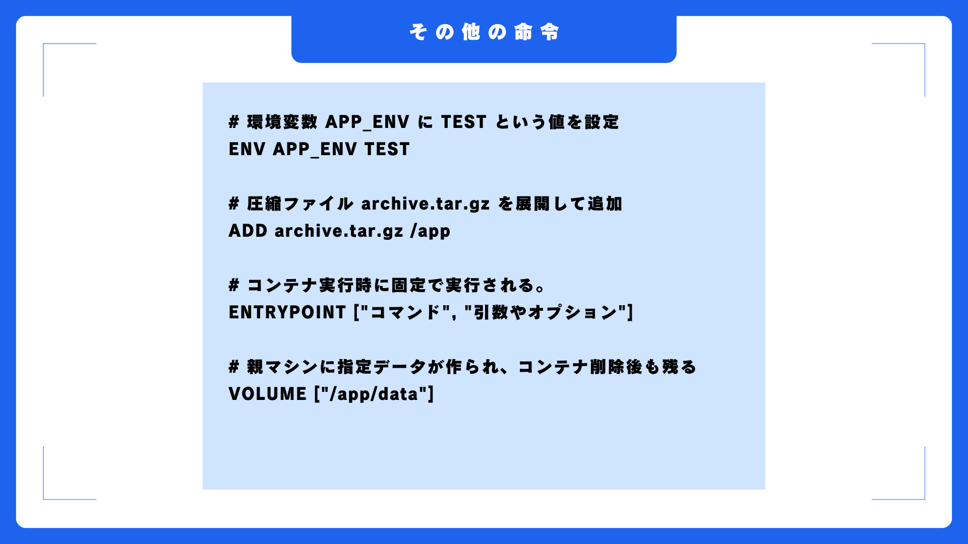 そのほかにも、環境変数を指定するENV命令、COPY命令とにているけれど圧縮ファイルの展開もしてくれるADD命令、CMDと似ているけれどデフォルトとは関係なく固定で実行してくれるENTRYPOINT命令、ホストマシン側にデータを持たせ消えないようにできるVOLUME命令などがあります。