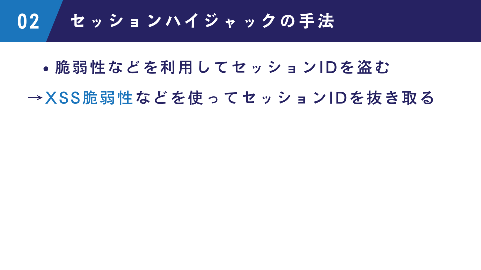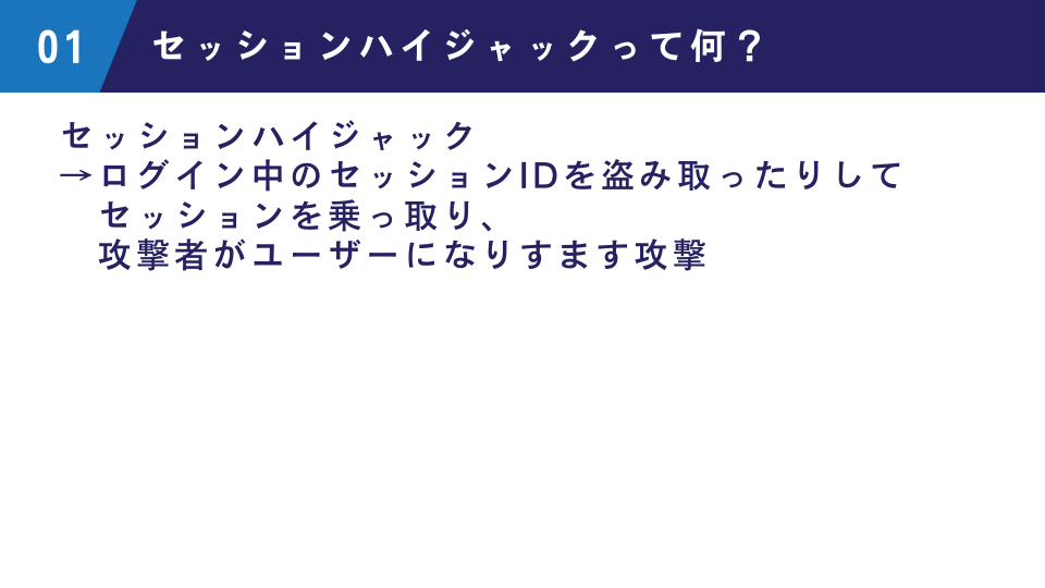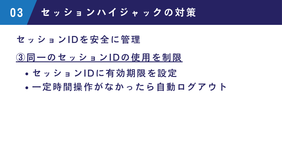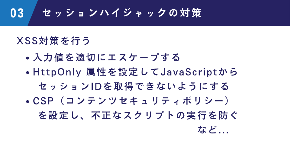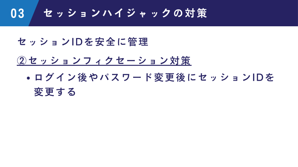 セッションIDが固定されていたり、ずっと同じだったりすると、攻撃者が使いやすくなっちゃうんだね。