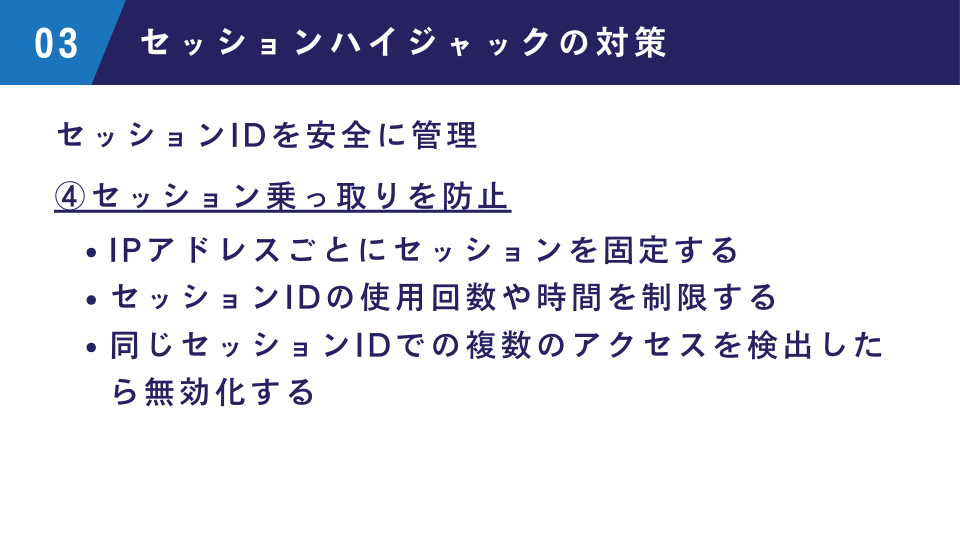 その通り!また、IPアドレスごとにセッションを固定する、セッションIDの使用回数や時間を制限する、同じセッションIDでの複数のアクセスを検出したら無効化するなど、不正なセッションIDの利用を制限するのも重要になるよ。