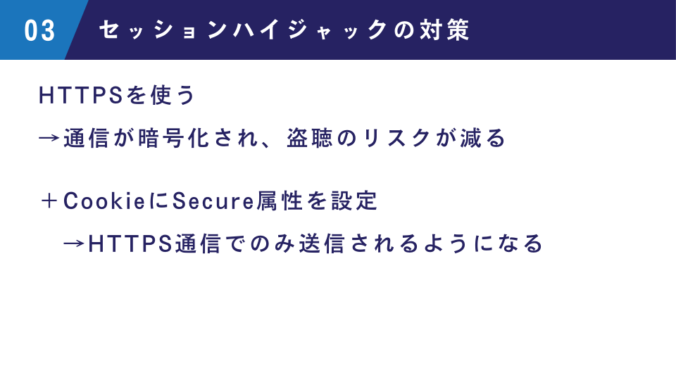次に、HTTPSを使うことです。すべての通信をHTTPSで暗号化することで、ネットワーク上でセッションIDを盗まれにくくするよ。
