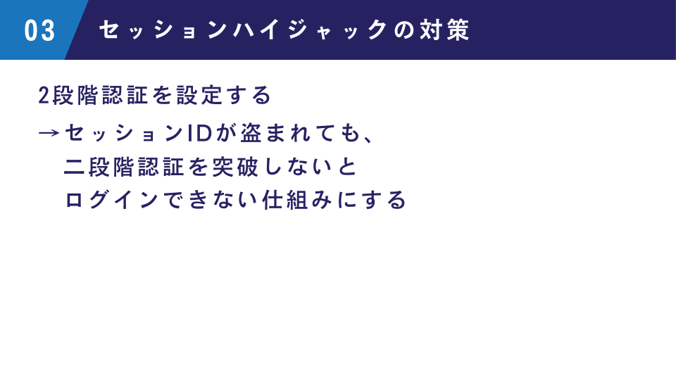 セッションIDが盗まれても、二段階認証を突破しないとログインできない仕組みにするのも有効だよ。