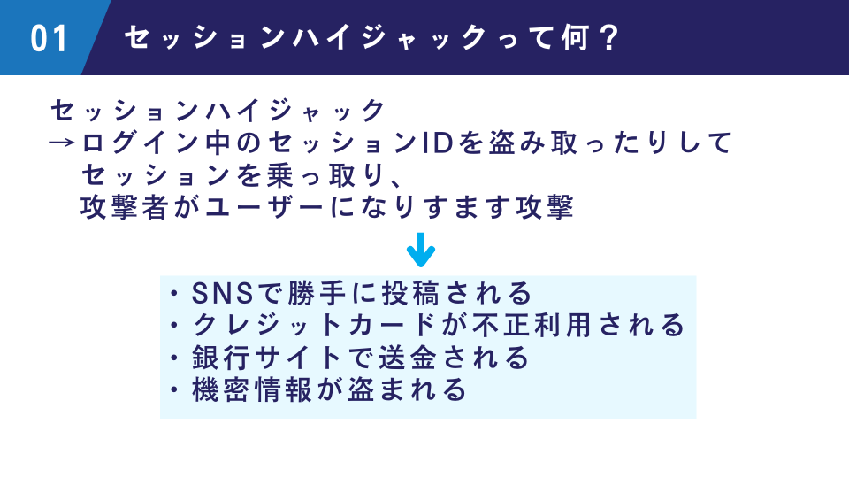 そう!ログイン状態を保持するための仕組みだよ!でも、そのセッションが乗っ取られてしまうと、ログイン中のアカウントが乗っ取られてしまうことになります。どんな攻撃なのか、また対策はどうすればいいのかについて解説していくよ!