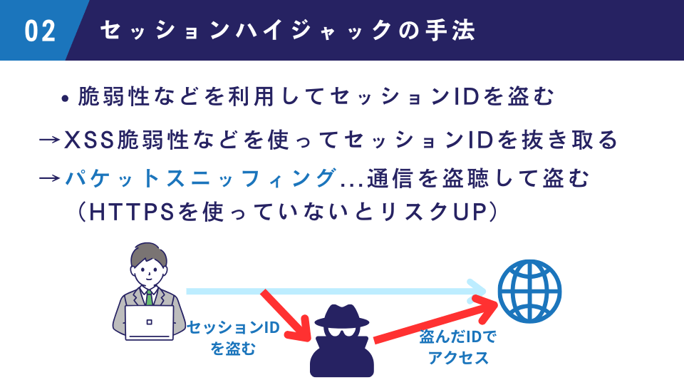セッションハイジャックは、ログイン中のセッションIDを盗み取ったりしてセッションを乗っ取り、攻撃者がユーザーになりすます攻撃です。