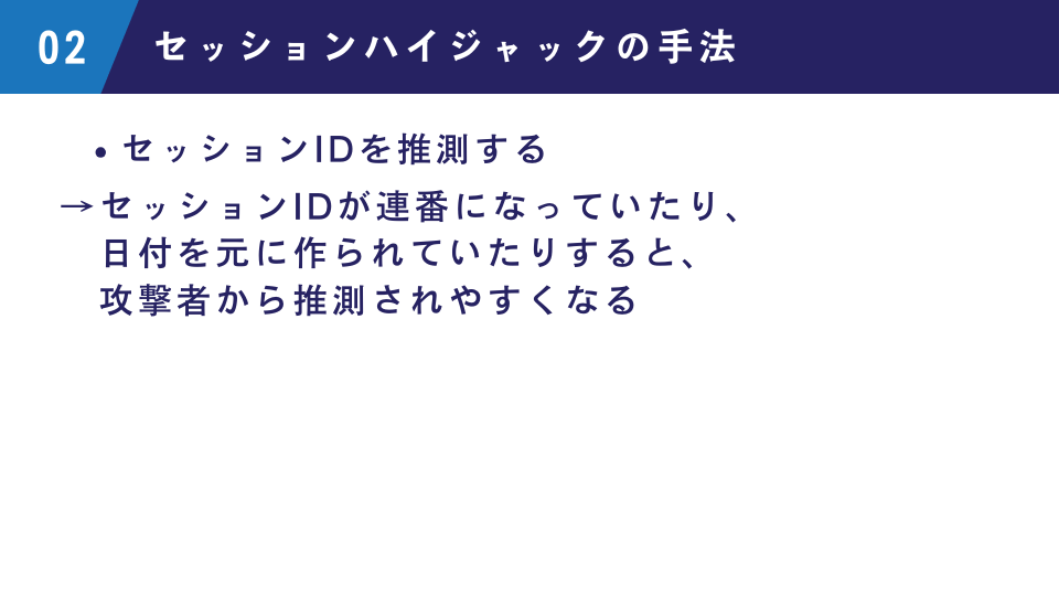 セッションIDが連番になっていたり、日付を元に作られていたりすると、攻撃者から推測されやすくなってしまうよ。
