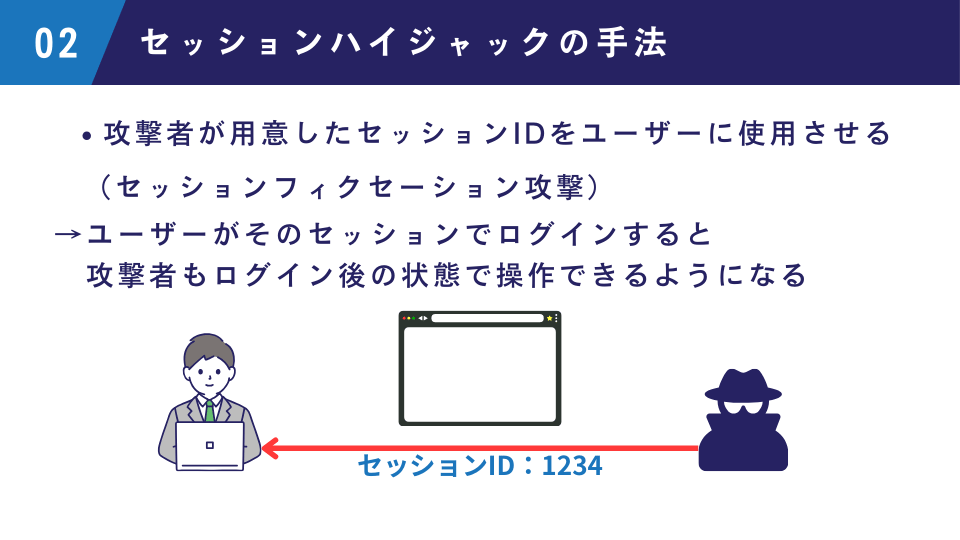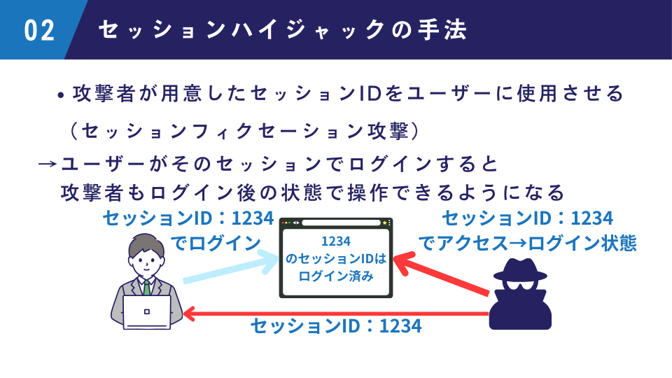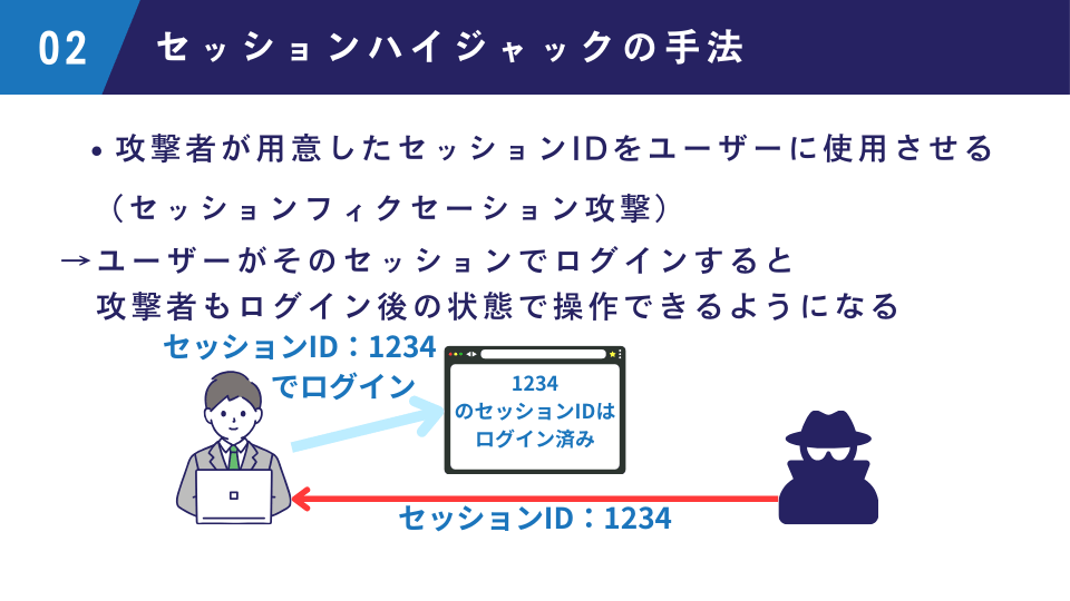 セッションIDを盗んで使うだけじゃなくて、ユーザーに押し付けて使わせる、みたいな手法もあるんだね...!漏洩させない対策だけしてもダメってことか。