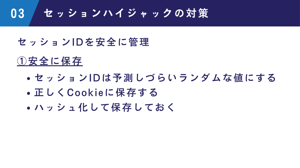 まずはセッションIDは予測しづらいランダムな値にし、正しくCookieに保存すること。さらにハッシュ化して保存しておくことで、万が一漏洩してもリスクを軽減できるよ。