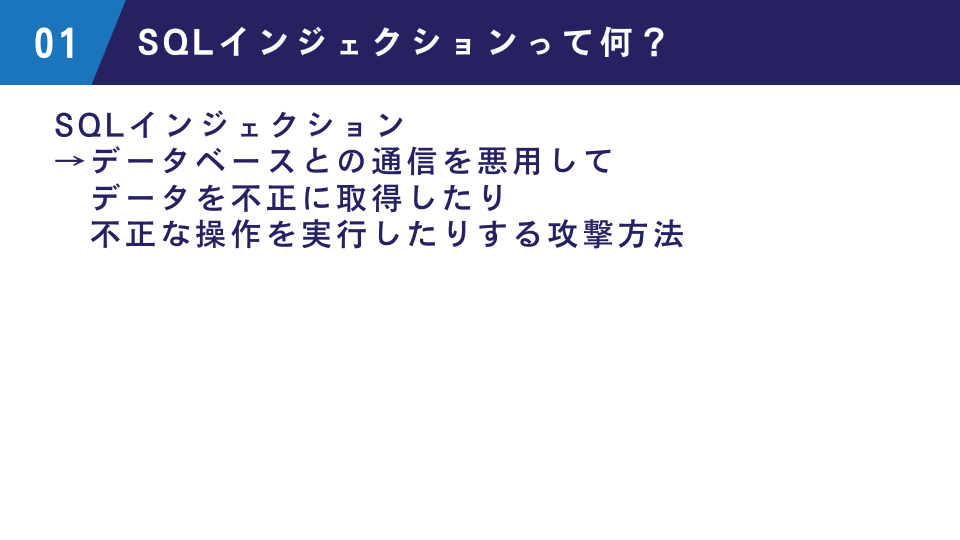 うんうん。Webアプリケーションで扱う多くのデータがデータベースに保存されているね。このデータを安全に操作するためにSQLという言語が使われるんだけど、それを悪用した攻撃になります。
