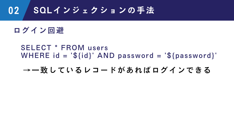 ログインフォームがこのようなSQLで処理をしていたとします。