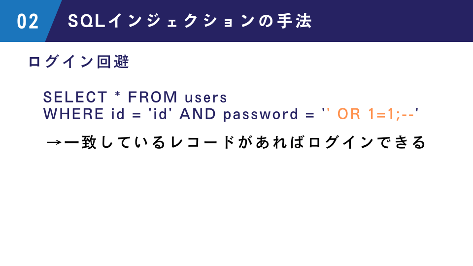 さっきの例だと、条件として入力した”1’ OR 1=1;--”がそのまま条件として扱われていれば問題ないよね。