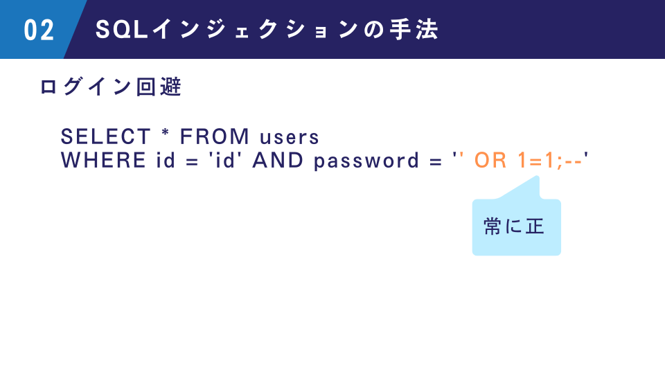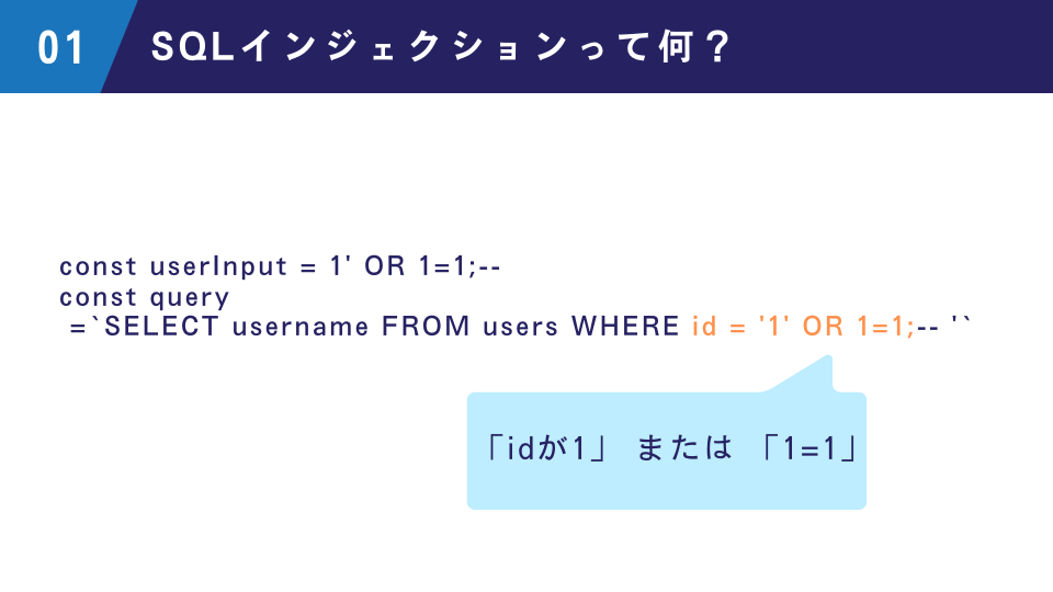 1 OR 1=1をこのSQLに組み込むと、「idが1、または1=1」が検索の条件になるよ。1=1は常に真だから、結果として全てのユーザー情報が取得されてしまいます。