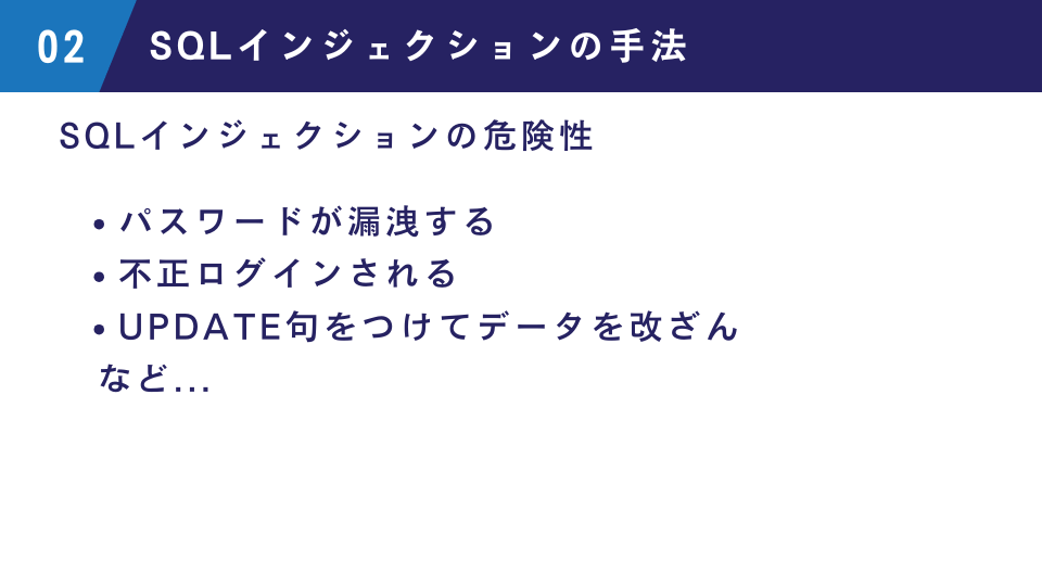 そうなんだ。SQLインジェクションではパスワードが漏洩する危険もあるし、そもそもパスワードがわからなくてもログインされてしまう危険もあるよ。他にもUPDATE句を付け足してデータを改ざんしたり、色々な攻撃ができます。