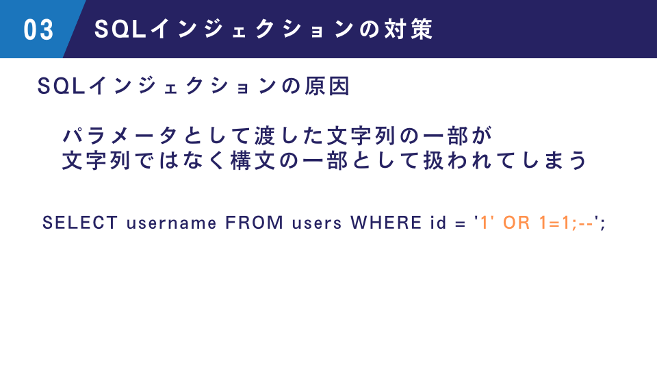 SQLインジェクションの根本的な原因は、パラメータとして渡した文字列の一部が文字列ではなく構文の一部として扱われてしまうことです。