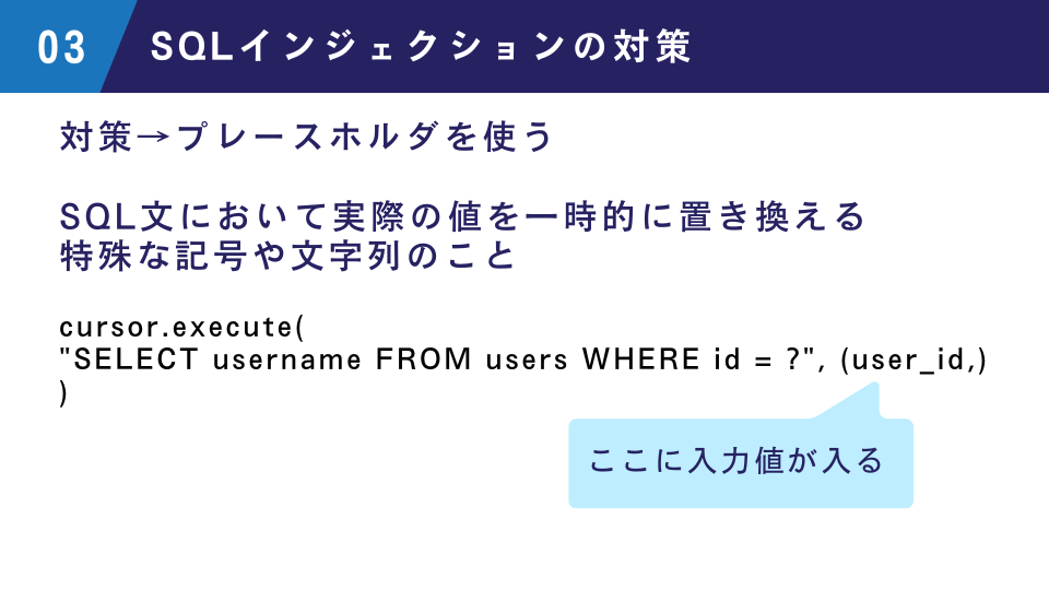そうそう。なので対策としては、プレースホルダを使ってSQLを組み立てることで、渡したパラメータを正しくパラメータとして扱い、SQL文自体が変更されてしまうのを防ぎます。