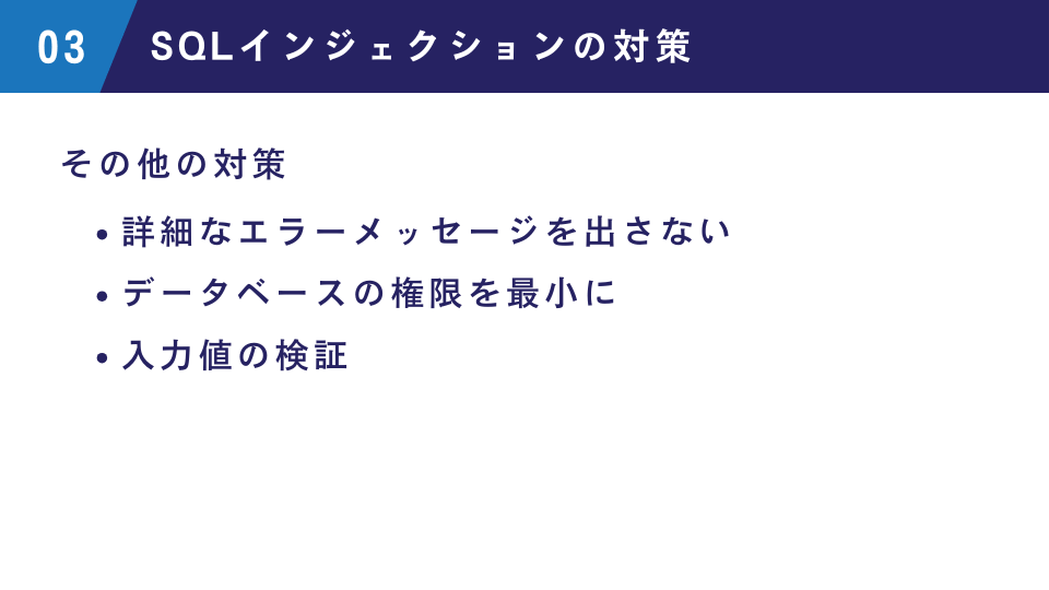 うんうん!そして最後に、入力値の検証です。例えばIDだったら数値の入力のみを許可するとか、制限をしておけば防げる攻撃もあります。