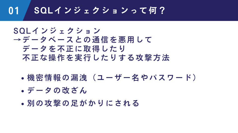 SQLインジェクションとは、アプリケーションがデータベースと通信するときの安全性を脅かす攻撃方法の1つです。データベースのクエリ、SQL文ですね。に悪意のあるコードを挿入することで、機密データを不正に取得したり、不正な操作を実行したりすることができます。