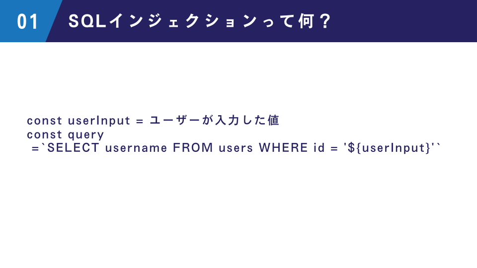 このように、ユーザーの入力値をそのままSQLに組み込むコードがあるとします。ユーザーが入力した値を条件としてSQL文の中に入れて、ユーザー情報を検索する処理になっているよ。