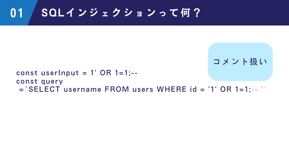 その通り!これがSQLインジェクションの怖さだよ。そしてさらに、それ以降は「--」の後ろだからコメント扱いになって、無視されちゃいます。