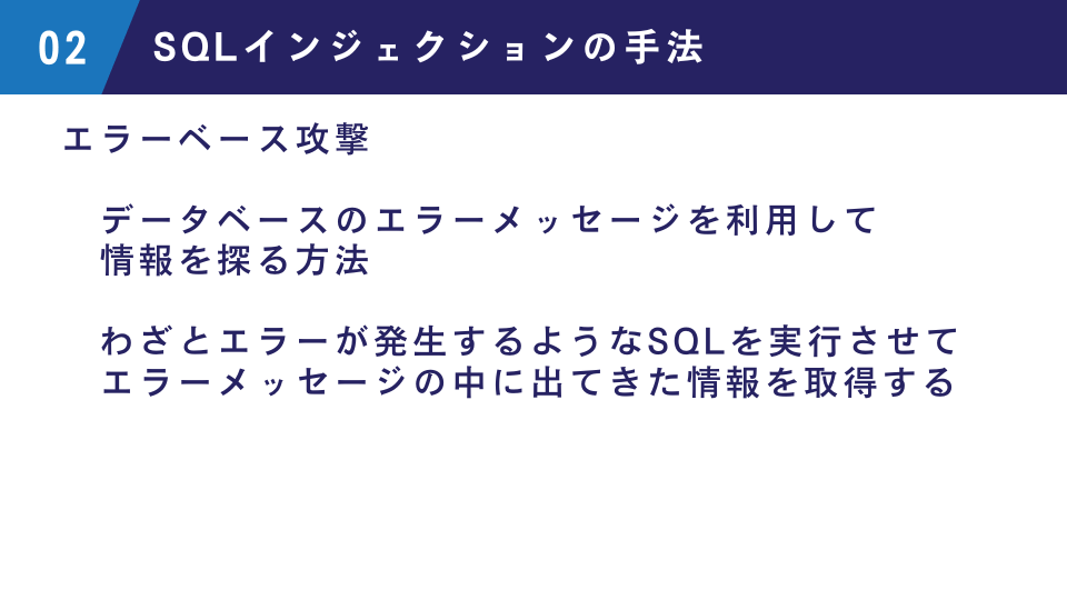 まずはエラーベース攻撃です。データベースのエラーメッセージを利用して構造や情報を探る方法だよ。わざとエラーが発生するようなSQLを実行させて、エラーメッセージの中にカラム名とかデータの内容を表示させて情報を探ります。