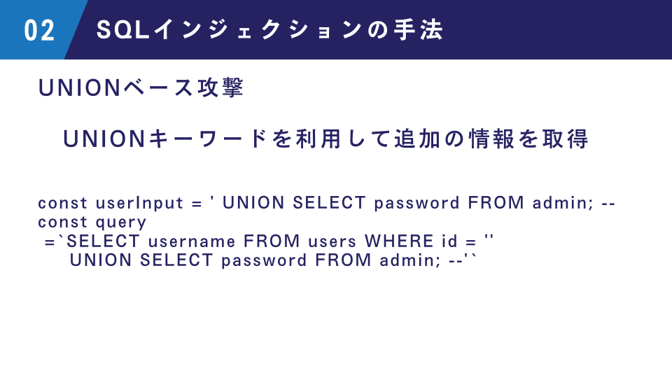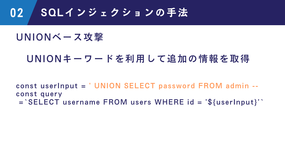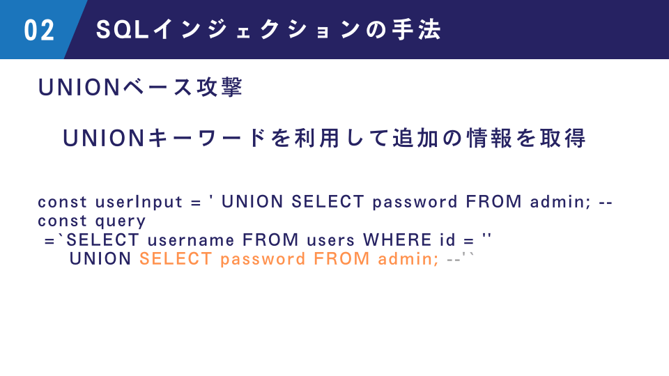 一行目の部分、元のクエリではusersテーブルのusernameを取得しているけど、攻撃者はUNIONを使ってadminテーブルのpasswordを取得しようとしているよ。