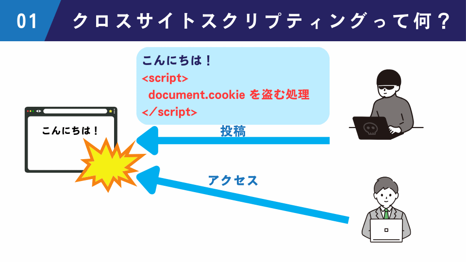 早速ですが、まずはクロスサイトスクリプティングとは何かについて説明していきます。よく「XSS」って略して呼ばれることも多いので、こちらも覚えておいてください!