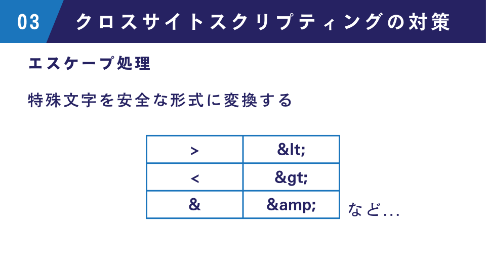 まず「エスケープ処理」は、特殊文字を安全な形式に変換することだよ。例えばこんな感じで変換します。
