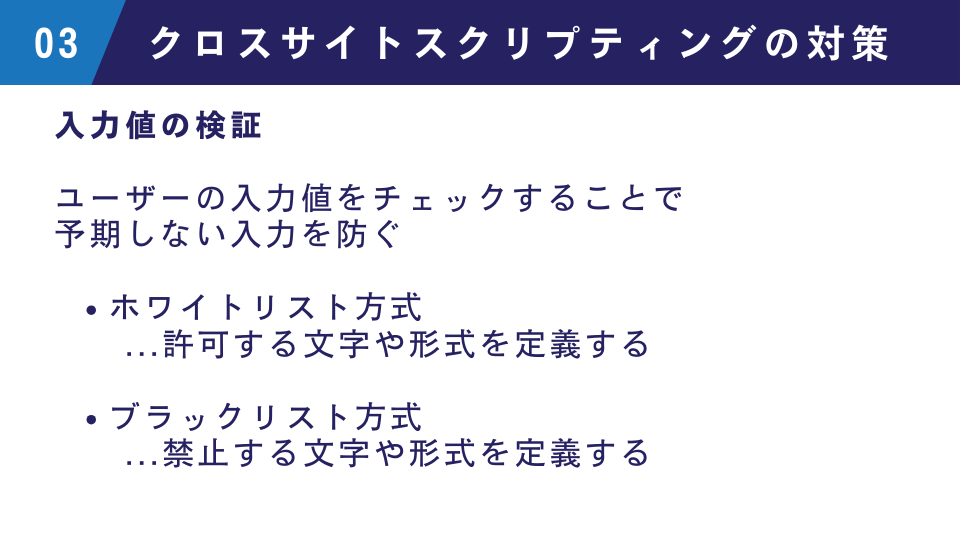 基本的にはホワイトリスト方式の方が安全だけど、自由入力の入力欄とかではあまり対策できないので注意です。