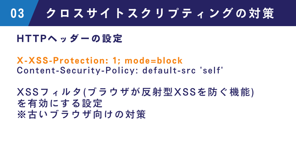 これはデフォルトでは有効なんだけど、ユーザーが無効に設定していることもあります。そこで、X-XSS-Protectionを使うとこの設定を上書きして有効にすることができるよ。ただ、現在最新のブラウザではこれはほとんどサポートされていないので、古いブラウザ向けの対策になります。