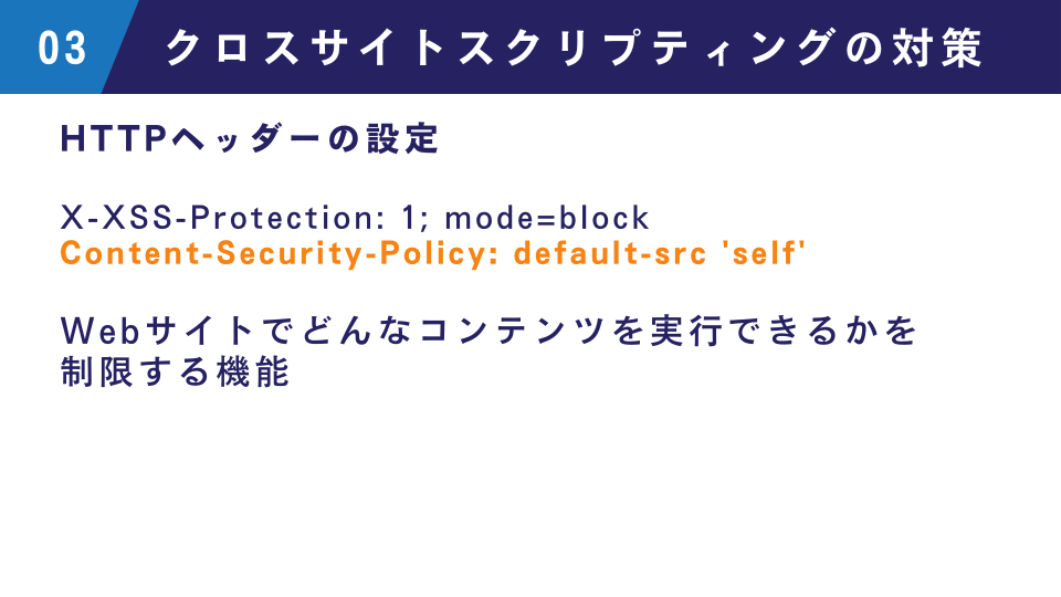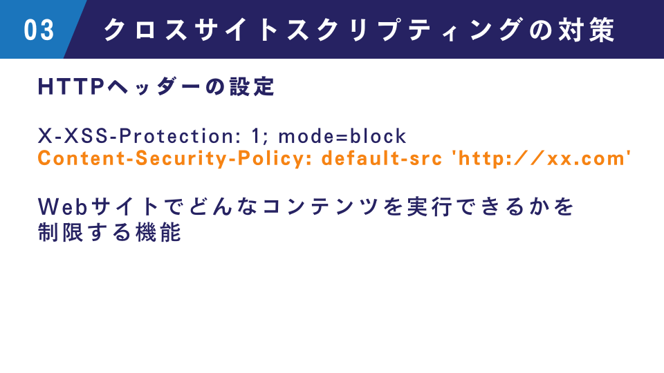次にContent-Security-Policy(CSP)は、Webサイトでどんなコンテンツを実行できるかを制限する機能だよ。