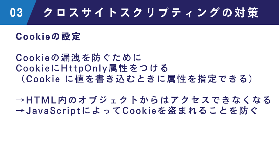 次にCookieの設定です。これは、クロスサイトスクリプティングへの対策というよりは、Cookie情報の漏えいを防ぐ仕組みだよ。CookieにHttpOnly属性というものを付けるとHTML内のスクリプトからはアクセスできないようになります。