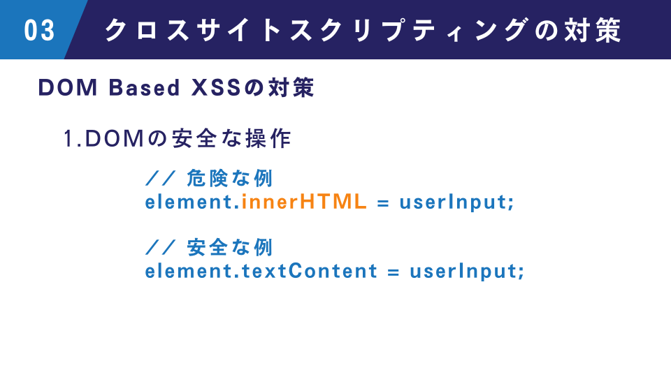 まずはDOMの安全な操作についてです。innerHTMLはHTML文字列を直接埋め込むため、悪意のあるスクリプトも実行される可能性があります。