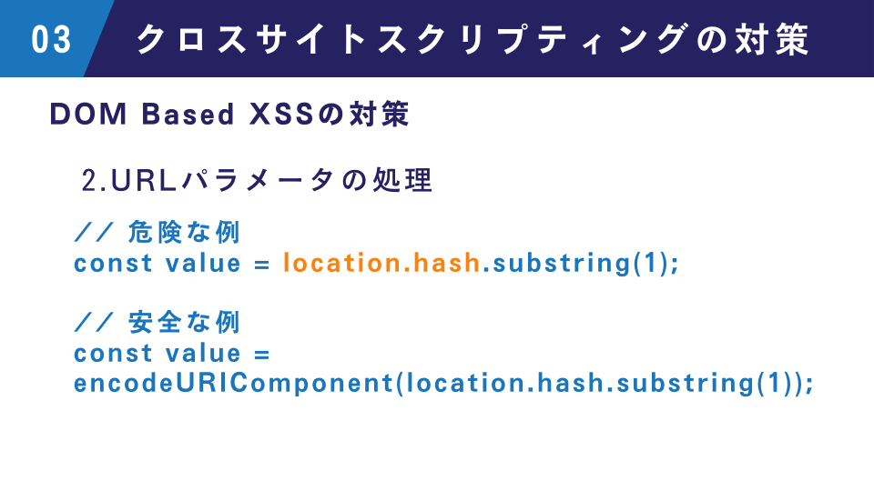 次にURLパラメータの処理についてです。location.hashには任意の文字列が含まれる可能性があるので、<script>タグなどの悪意のある入力をエスケープせずそのまま使用すると、プログラムが実行されてしまいます。
