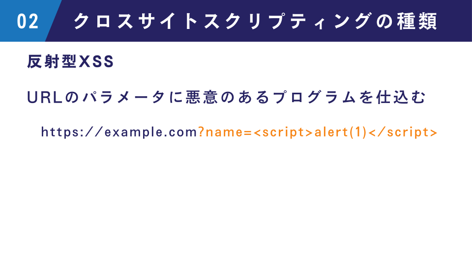 まず「反射型XSS」というものがあるんだ。これは、URLのパラメータに悪意のあるプログラムを仕込む方法だよ。パラメータっていうのは、こんな感じでアドレスの最後につく「?」以降の部分のことです。