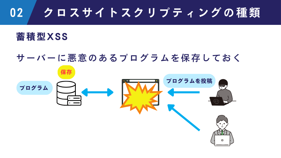 次は「蓄積型XSS」。これは、さっき説明した掲示板での例みたいにサーバーに悪意のあるプログラムを保存しておく方法だよ。