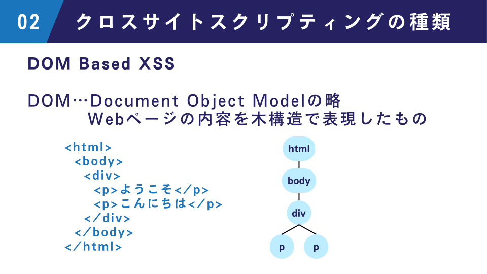 その通り!で、DOM Based XSSは、JavaScriptがこの構造を操作する時に発生する脆弱性なんだ。
