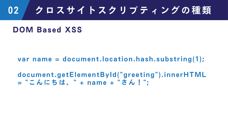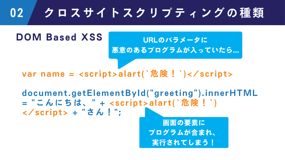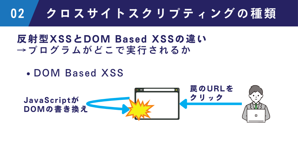 対してDOM Based XSSは、ユーザーが悪意のあるURLをクリックするとJavaScriptがURL内の値を読み取りその値を使ってDOMを書き換えることでブラウザでコードが実行されるという仕組みになります。