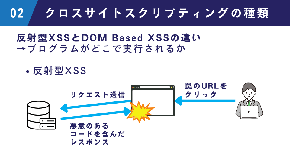 反射型XSSは、ユーザーが悪意のあるURLをクリックするとリクエストがサーバーに送られ、サーバーがそのまま悪意のあるコードを含んだレスポンスを返すことでブラウザでコードが実行されるという仕組みになっています。